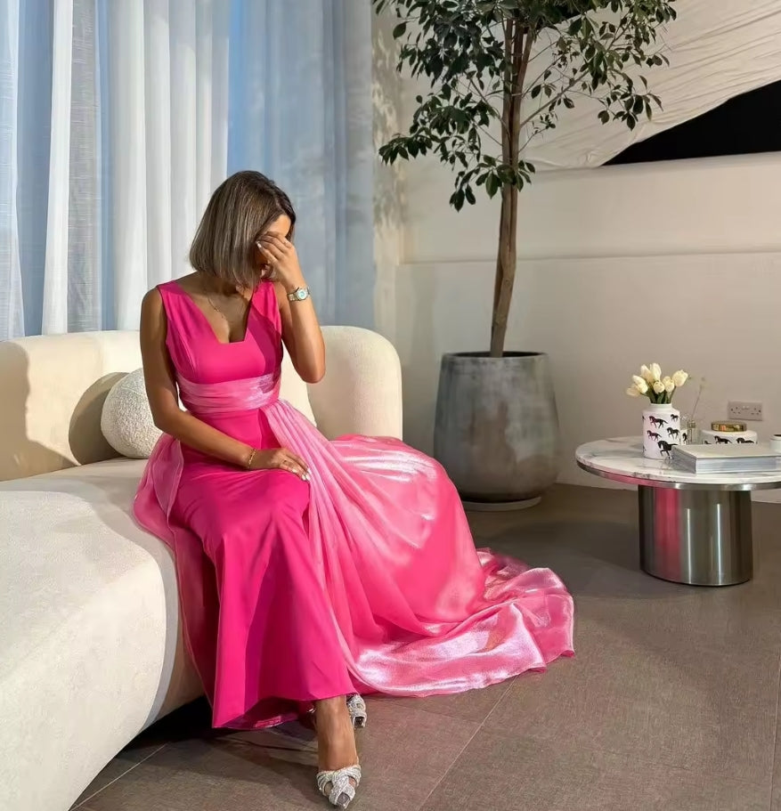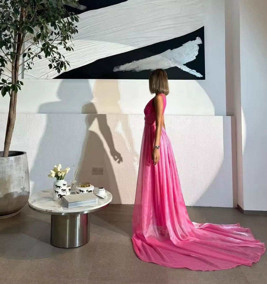 Hot Pink V Neck Prom Dresses with Tail New Mermaid Evening Dresses Formal Dress