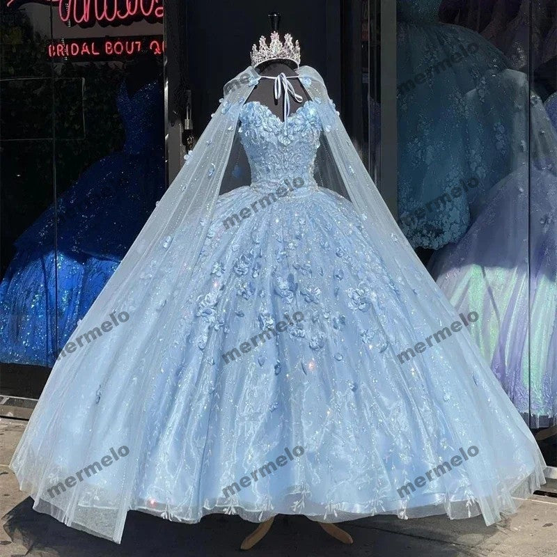 Light Blue 3D Flower Off Shoulder Quinceanera Dresses With Cape