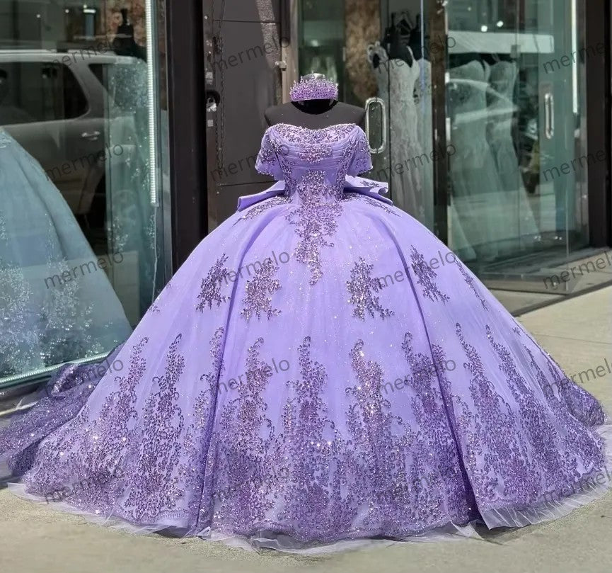 Lilac Purple Sparkling Princess Quinceanera Dresses Elegant Beaded Applique Bow Sweet Train