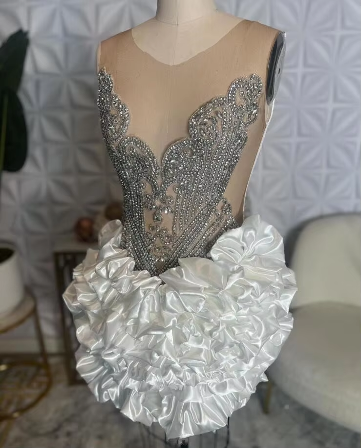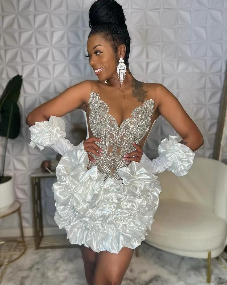 Little White Dress Sparkly Short Prom Homecoming Dresses for Black Girl Luxury Diamond Crystal Birthfay Gala Gown with gloves