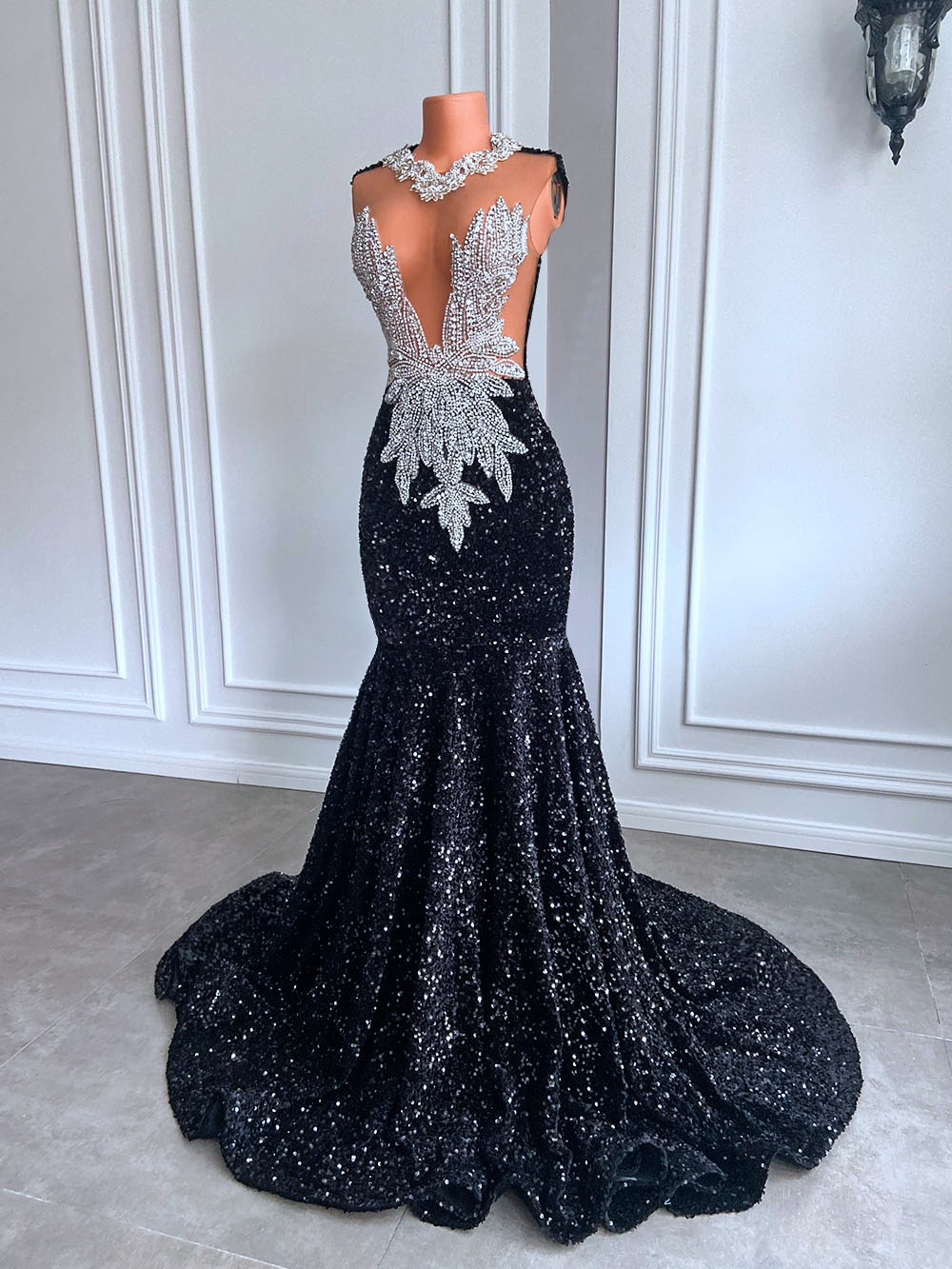 Long Black Prom Dresses Sexy Mermaid Style Luxury Sparkly Beaded Diamond Sequined African Girl Prom Gala Formal Gowns