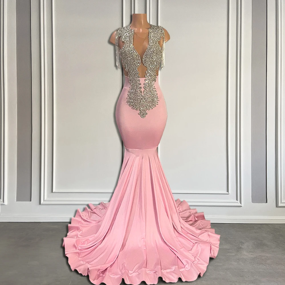 Luxury Diamond Long Pink Prom Dresses 2024 with Tassel Black Girl Sheer O Neck Beaded Mermaid Prom Gala Gowns