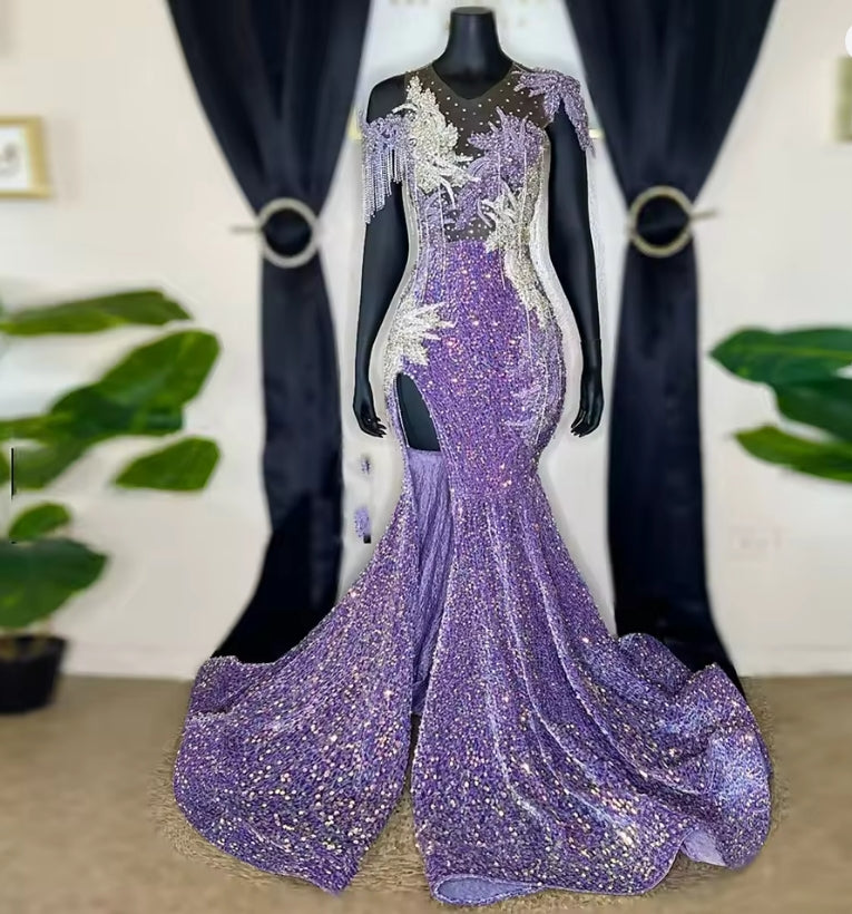 Luxury Diamonds Long Prom Dress 2025 Purple Beads Crystals Sequins Mermaid Birthday Wedding Party Gown Customized