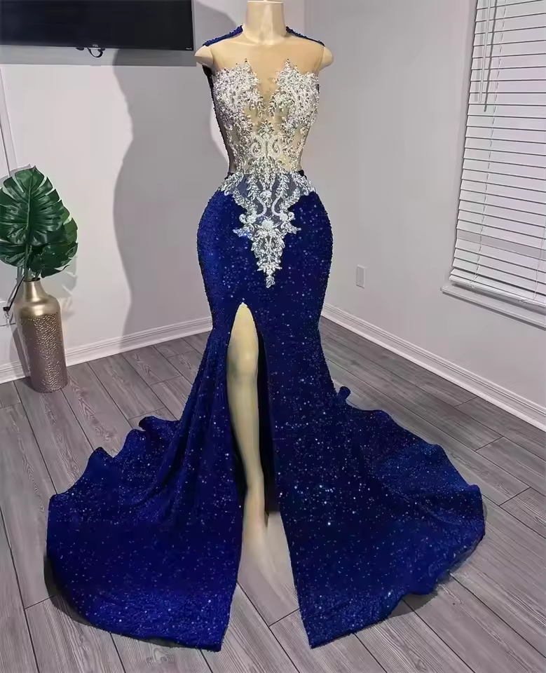 Luxury Royal Blue Lace Beaded Prom Dresses For Black Girl 2025 Sequins Front Split Wedding Reception Party Gown Customized