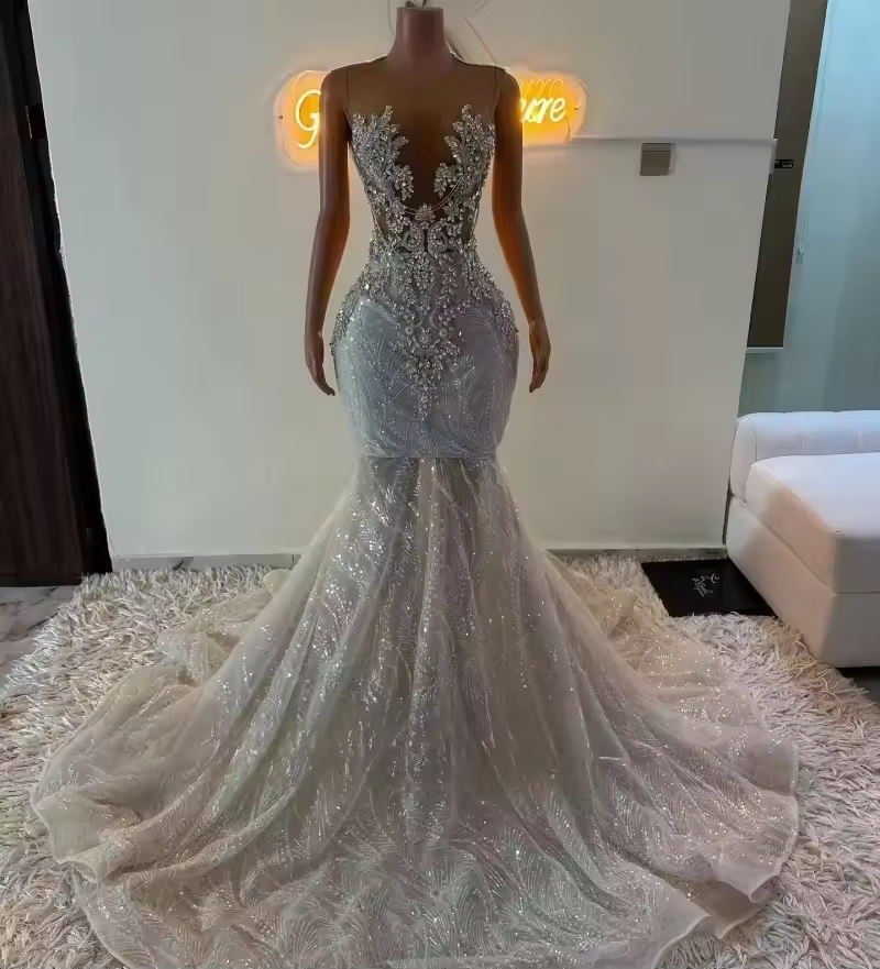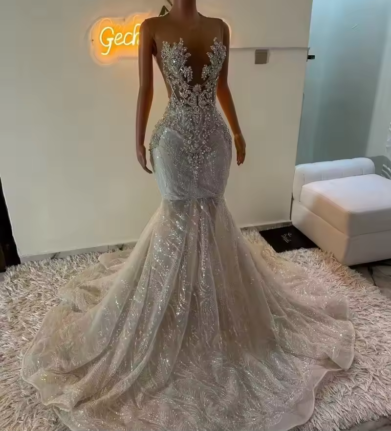 Luxury Silver Prom Dresses 2025 Black Girl Sequin Beading Mermaid Party Gowns African Women Crystal Evening Dress Customized