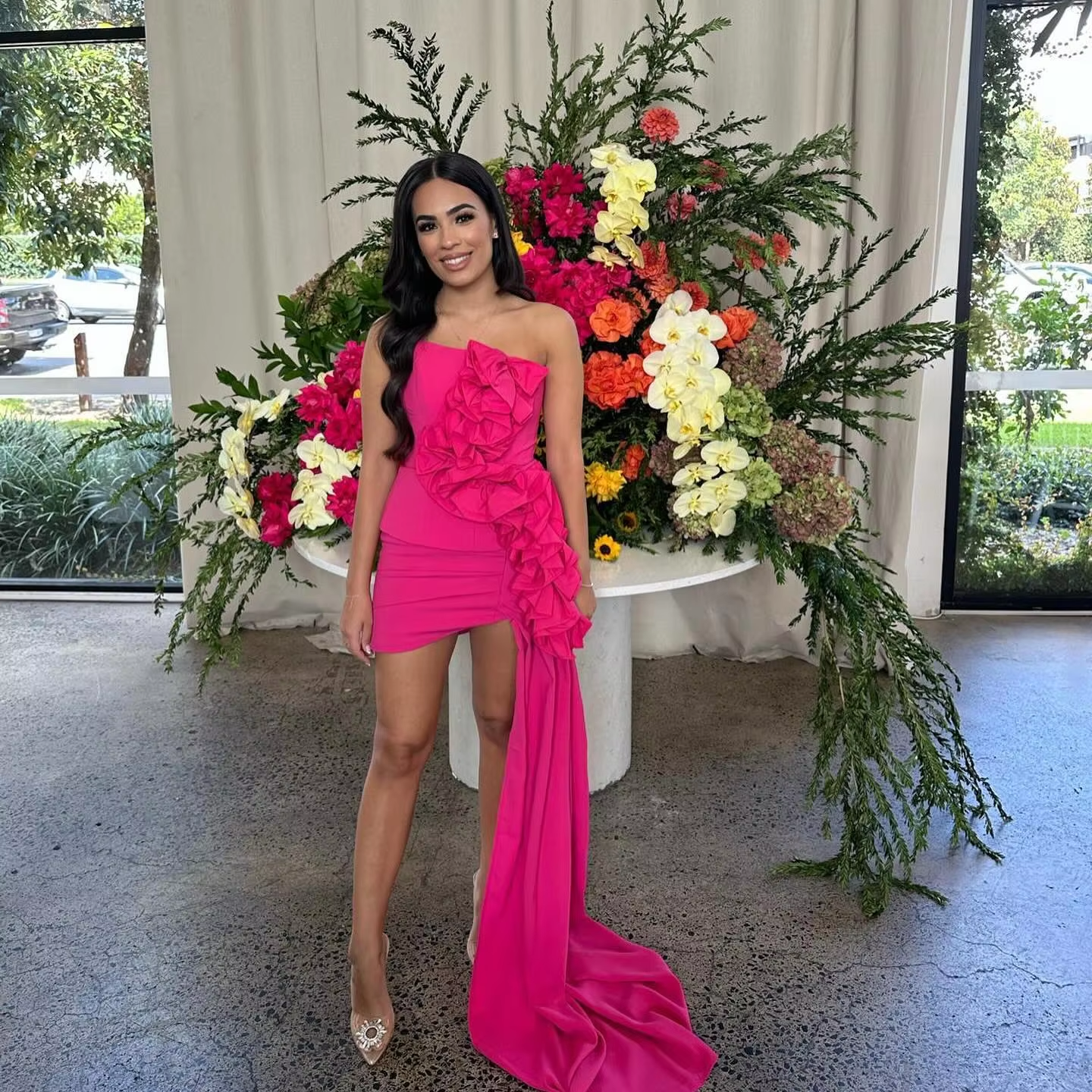 New Couture Fuchsia Stretchy Short Women Dresses With Ruffles Trimmed Details Pretty Strapless Mini Wedding Party Dress