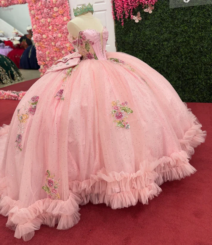 Off Shoulder Glittery Tulle Lace Beaded Pink Quinceanera Dresses for Sweet 16