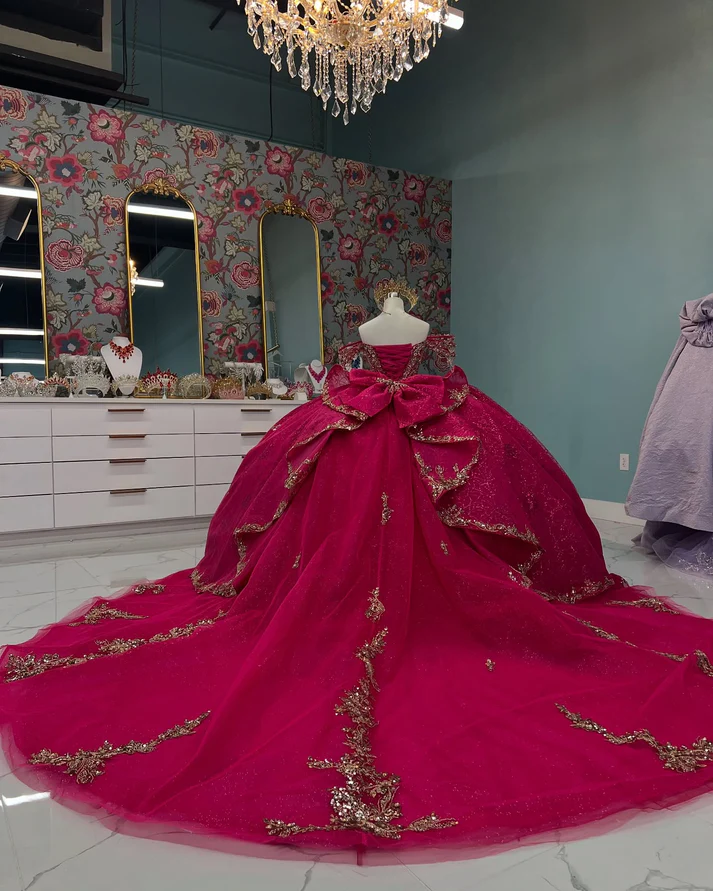 This stunning Off Shoulder Sleeveless Quinceañera dress in vibrant fuchsia showcases delicate beaded appliques that enhance its luxurious texture. The elegant bow knot detail adds a refined touch, perfectly balancing youthful charm with sophisticated design. Crafted to provide both comfort and style, this dress is ideal for making a memorable statement on your Sweet 15 celebration.
