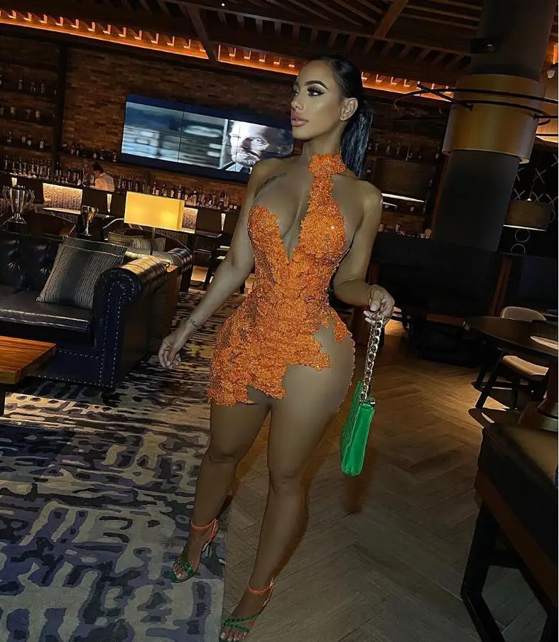 Orange Black Girls vestidos de gala Sequin Applique Short Birthday Dress High Neck Cocktail Porm Gowns Vestido Festas Luxo