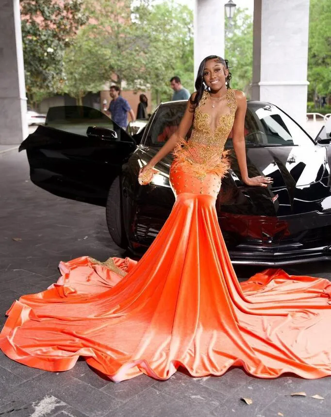 Orange Luxury Long Mermaid Prom Dresses for Women 2024 Sparkly Diamond Velvet African Black Girl Evening Gala Gown