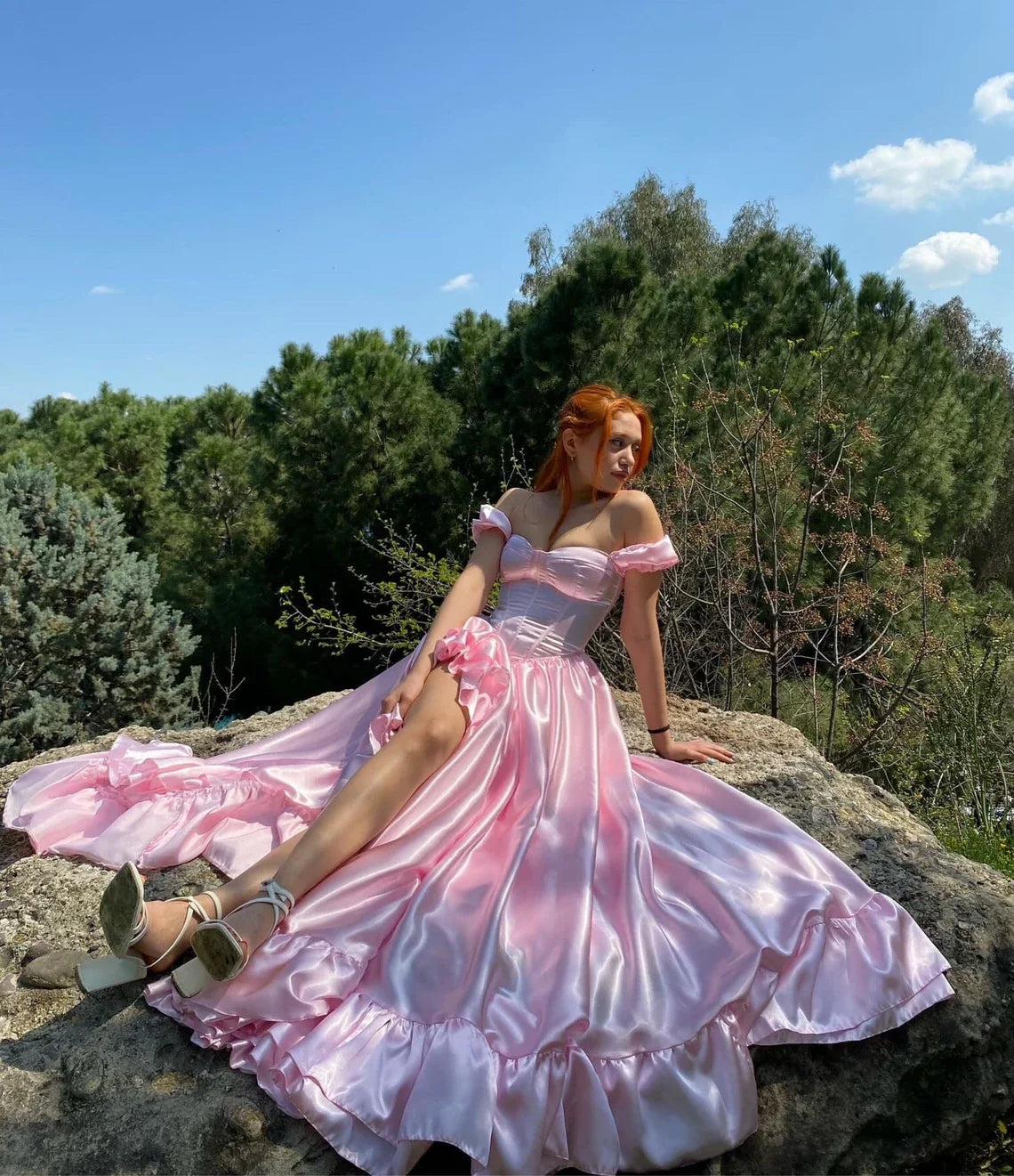 pink corset dress with ruffles on the sides/pink long princess dress/party, wedding, prom, graduation , halloween dress