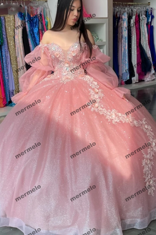 Pink Long Sleeve Quinceanera Dress Ball Gown Applique Beaded Sequins Corset Sweet 16