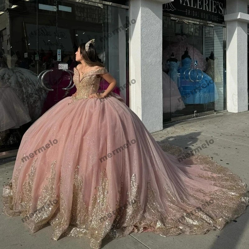 Pink Shiny Quinceanera Dresses Gold Lace Appliqued Crystal Off the Shoulder