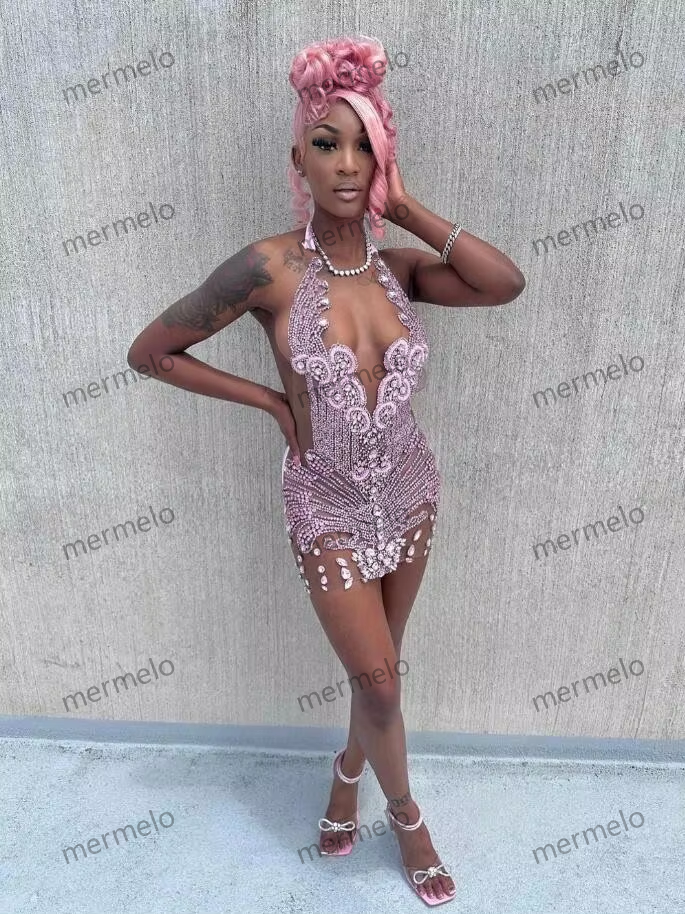 Pink Sparkly Short Prom Homecoming Dress Luxury Diamond Crystal Sheer Mesh Black Girl