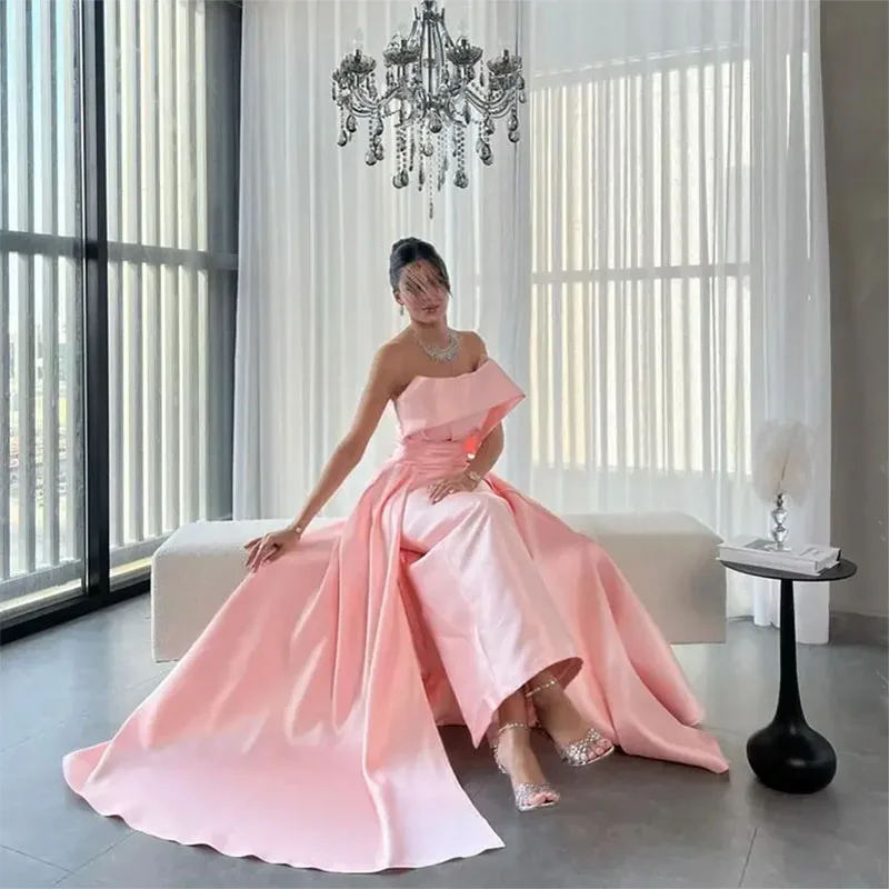 Pink Strapless Prom Dresses Sleeveless Pleated Floor Length Women Evening Gowns Saudi Arabia Wedding Party Dresses
