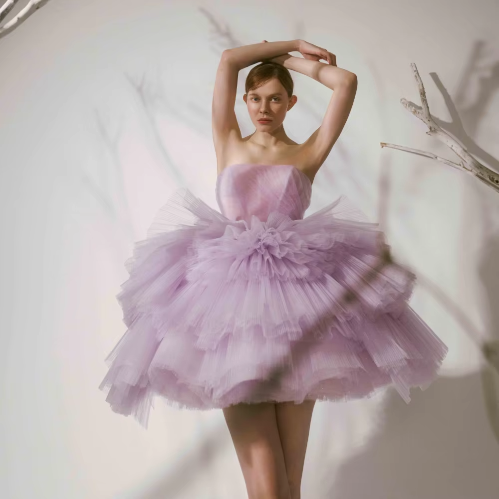 Pretty Lavender Tulle Tiered Layered Short Evening Dresses Party Strapless Puff Mini Female Bridal Gown
