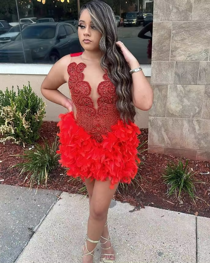 Red Luxury Short Prom Homecoming Dresses Sparkly Diamond Crystal Feather Birthday Party Gown robe de soirée de luxe 2024