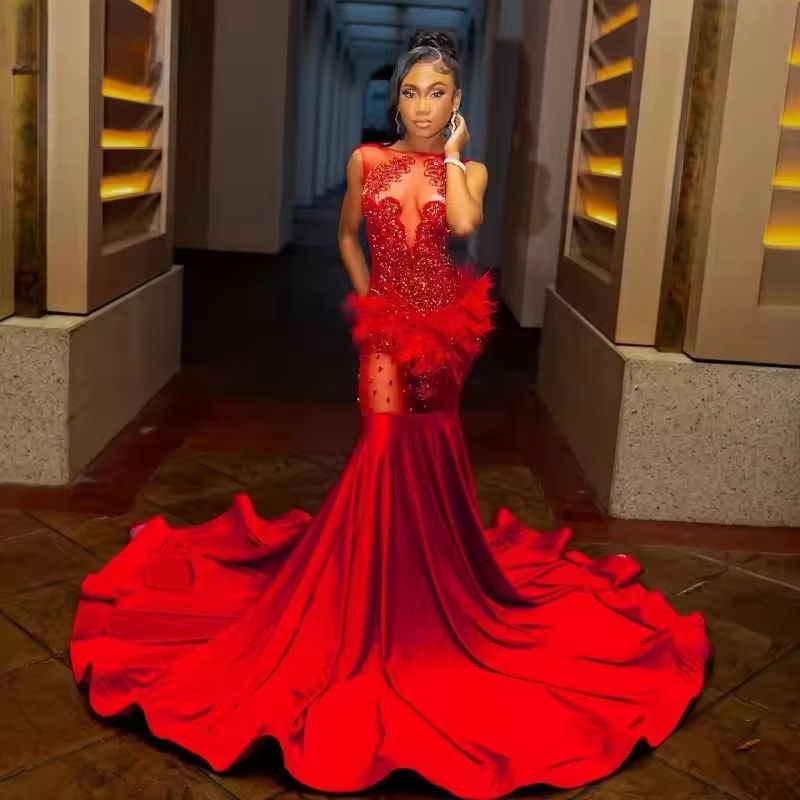 Red Satin Mermaid Prom Dresses Black Girls 2025 Luxury Crystal Feathers Party Gowns African Evening Dress Customized