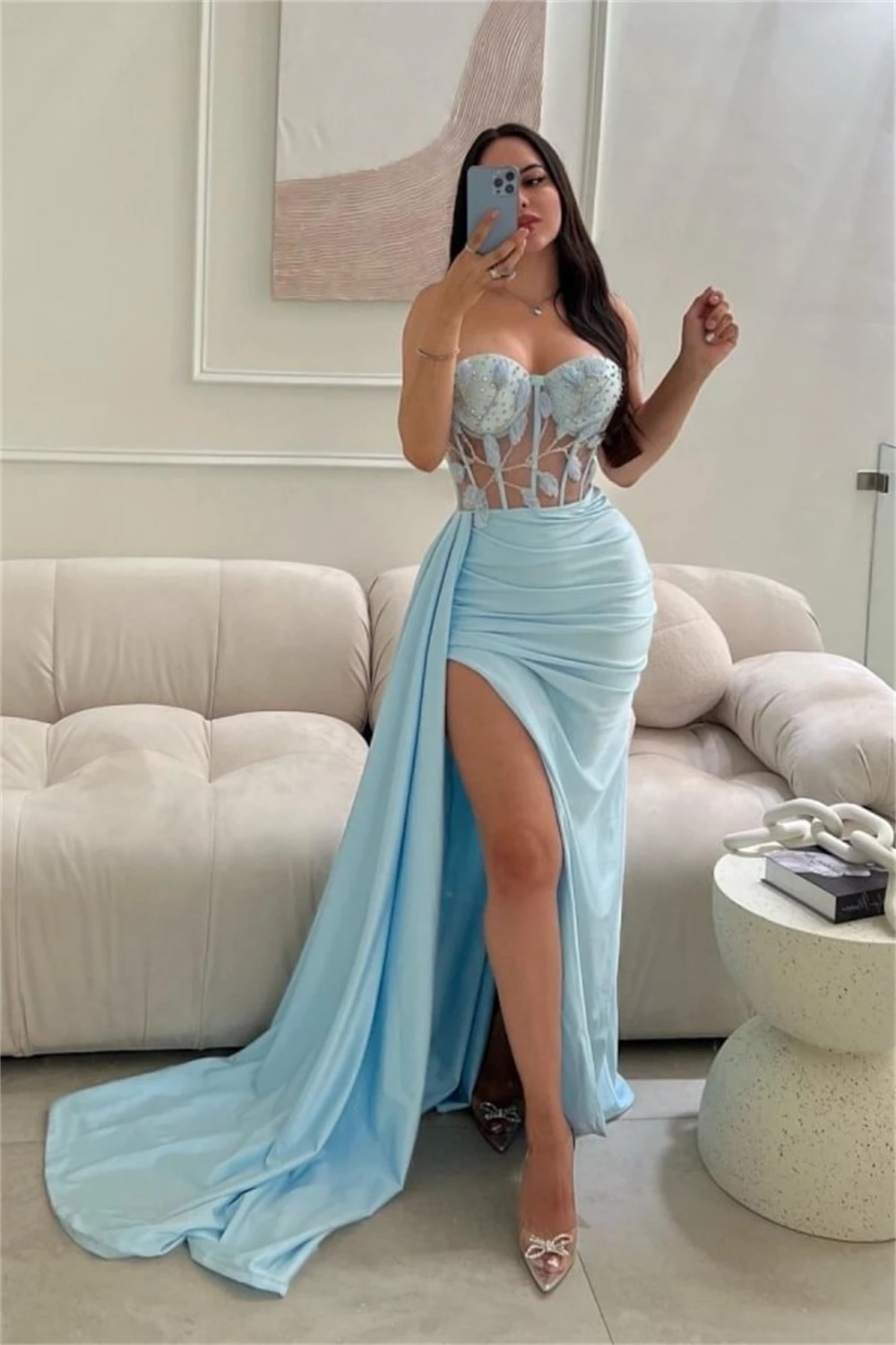 Satin Sweetheart Mermaid Prom Dresses With Split Sheer Corset Lace Appliques Formal Evening Party Sleeveless Long Ball Gowns