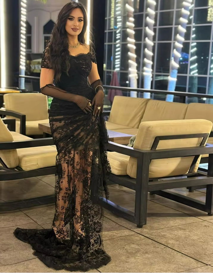 Sexy Black Lace Mermaid Evening Dresses Cap Sleeves Off Shoulder Wedding Formal Event Prom Gown vestidos High Quality