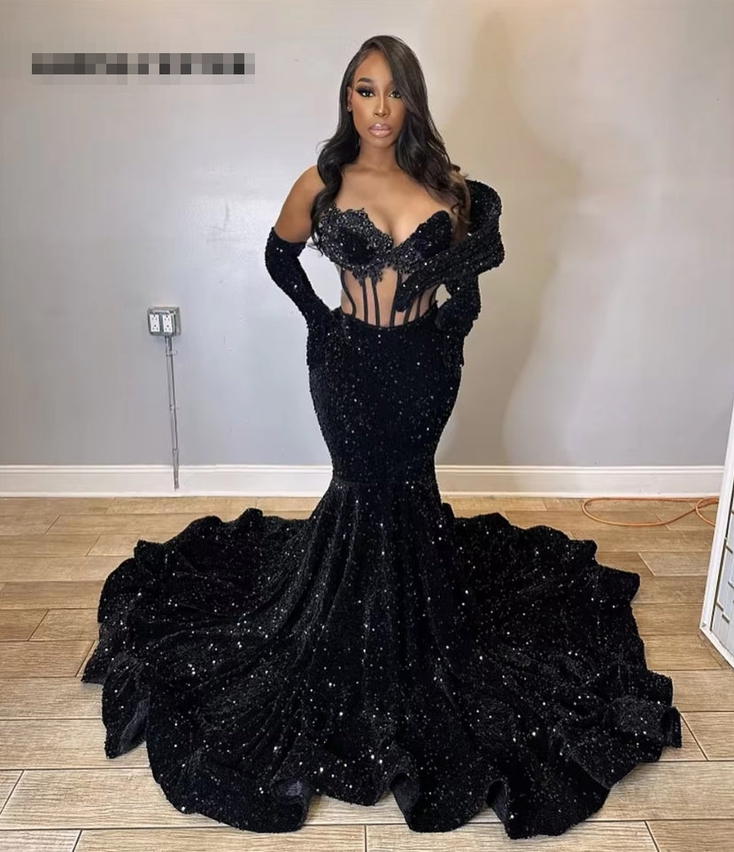 Sexy Black Sequin See Thru Mermaid Long Prom Dresses With Gloves Halloween Afican Elegant Dress For Wedding Party Evening Gowns