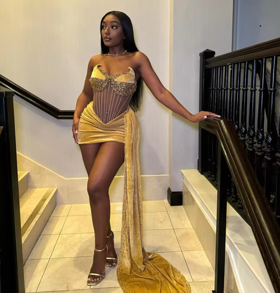 Sexy Gold Prom Dress Velvet Luxury Crystal Beads Birthday Party Cocktail Gown Illusion Homecoming Robe De Bal Lace Up Back