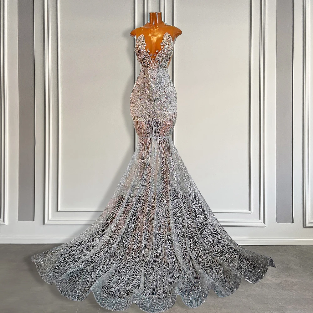 Sexy See Through Sequin Prom Dress for Black Girl Long Luxury Silver Crystal Mermaid Prom Graduation Party Gowns