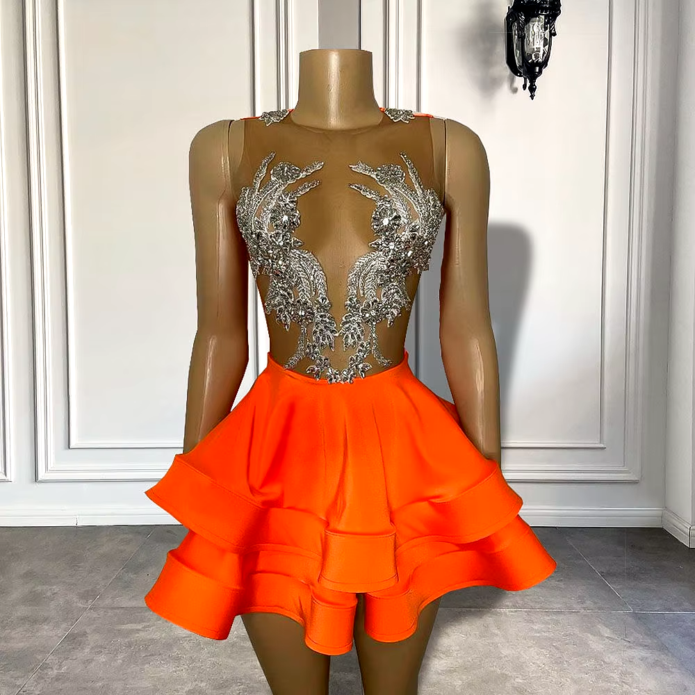 Sexy See Through Women Birthday Party Gowns Sparkly Silver Crystals Orange Black Girls Orange Short Mini Prom Dresses 2024