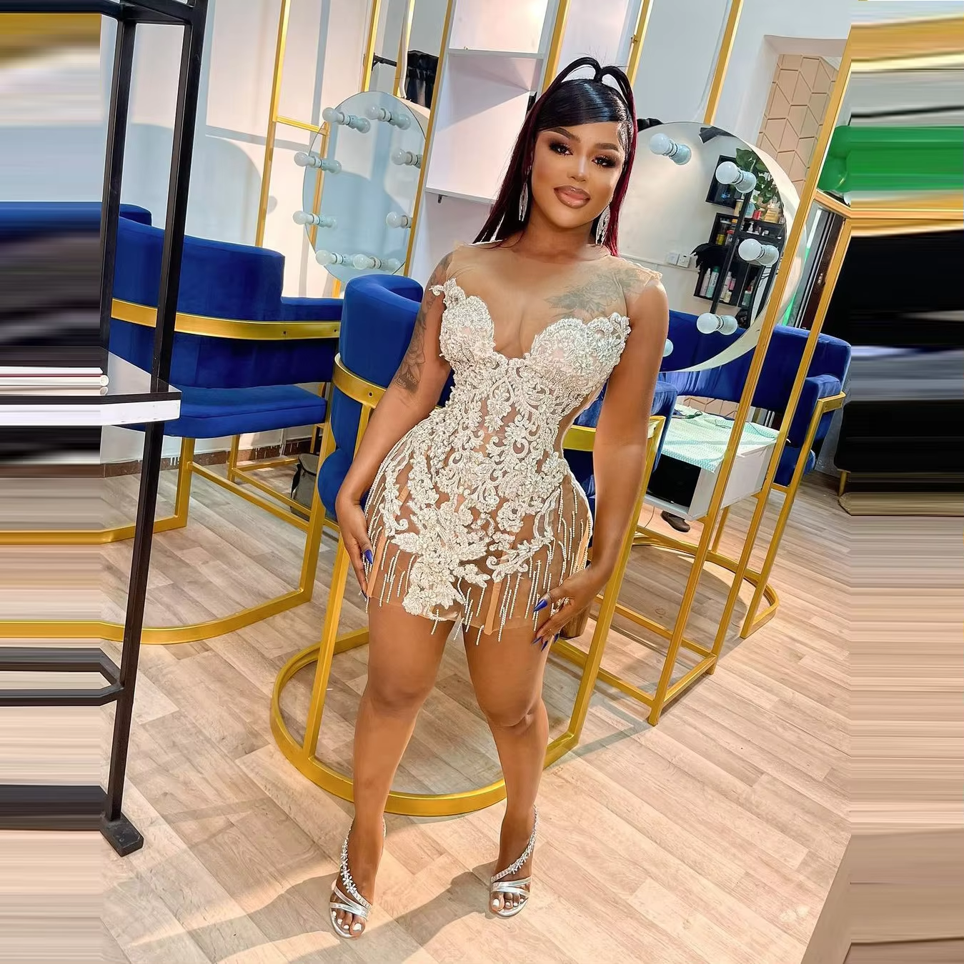 Sexy Short Lace Prom Dresses Mini Length Women Bodycon Evening Gowns Tassels Beaded Illusion Cocktail Dress Custom Made