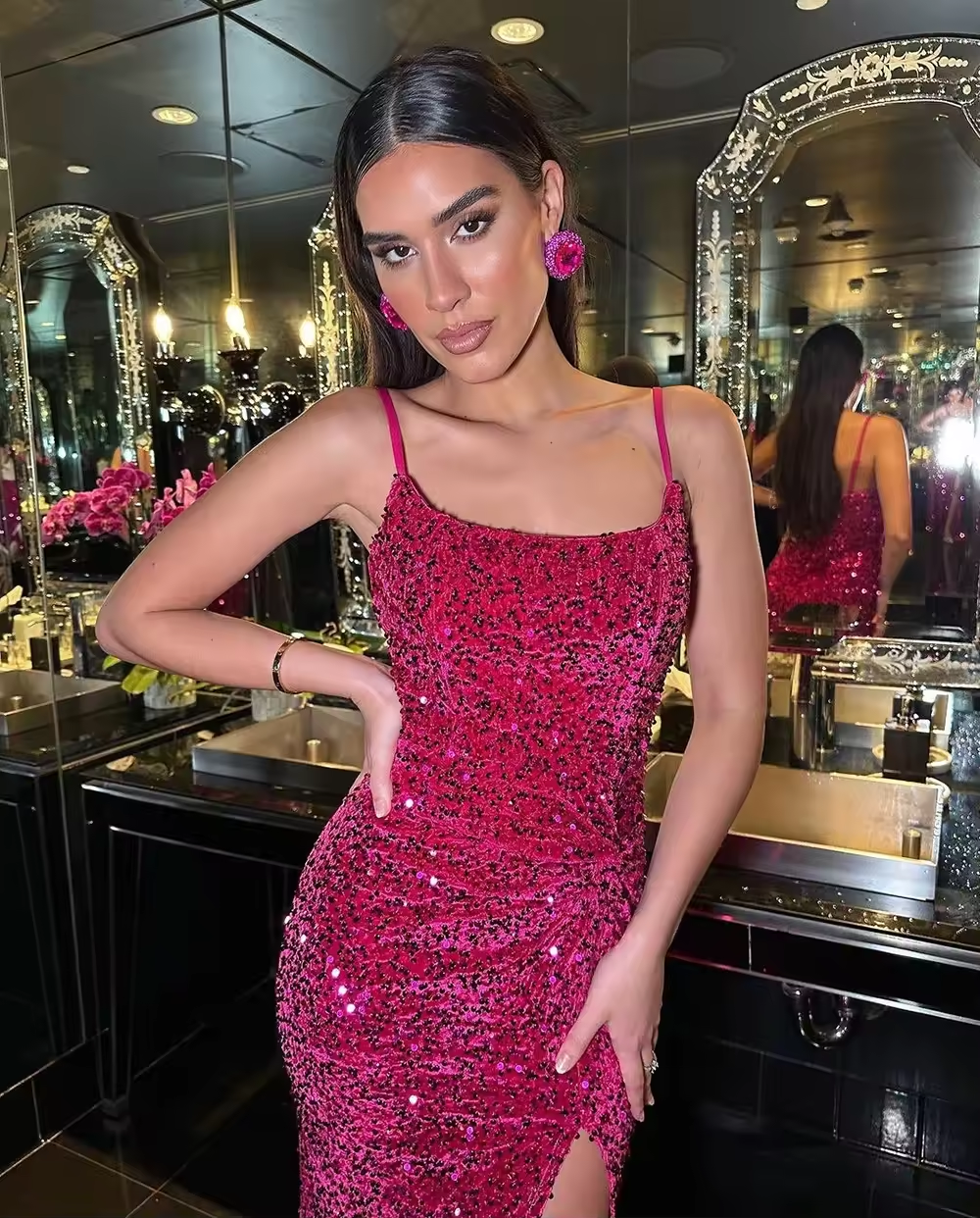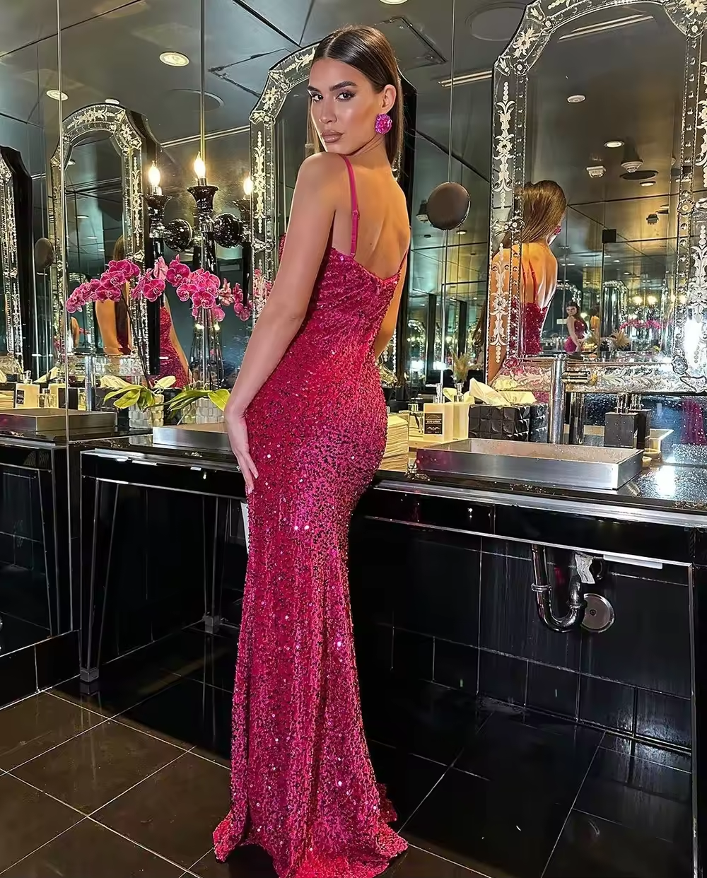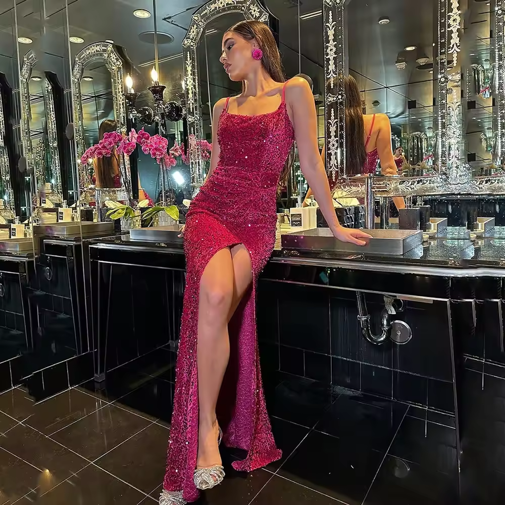 Sexy Side Split Evening Dress Spaghetti Strap Backless Mermaid Prom Dress Sequin Velour Night Party Dress Customized