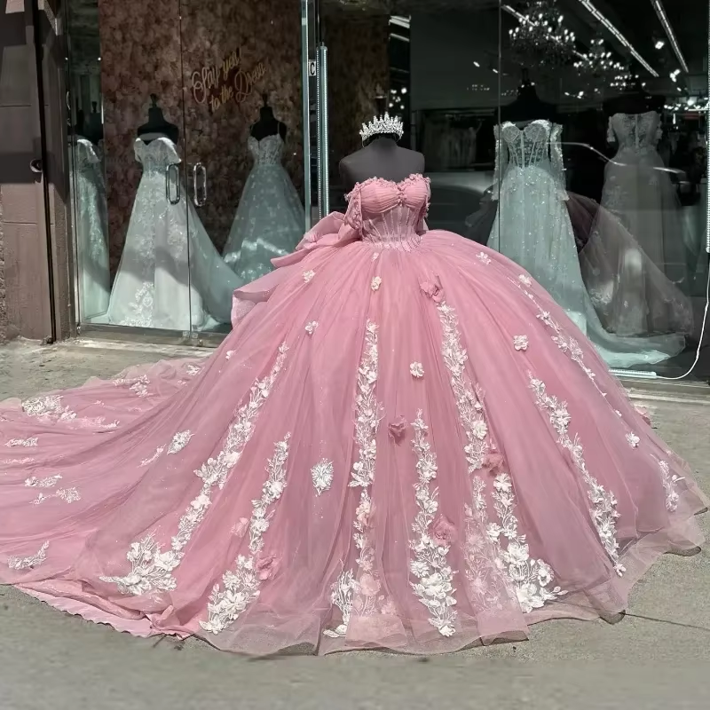 Shinning Girls Princess Pink Quinceanera Dress Pretty Floral Applique Beading Off Shoulder Mexico Corset Sweet 16 Vestido De 15