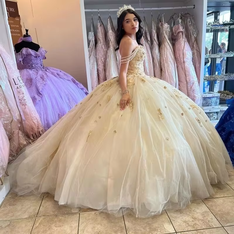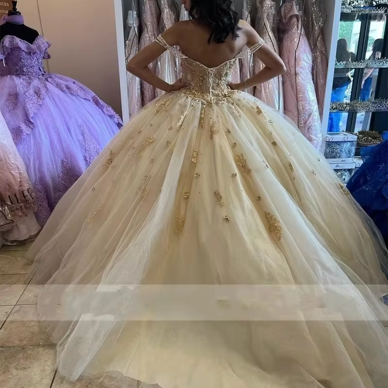 Shiny Champagne Quinceanera Dresses Luxury Birthday Party Ball Gown Sweetheart Beading Appliques Corset Court Train