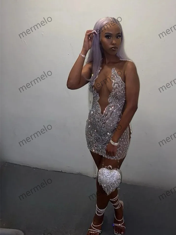 Silver Short Prom Dresses For Black Girls Beaded Crystal Birthday Party Homecoming Dress
