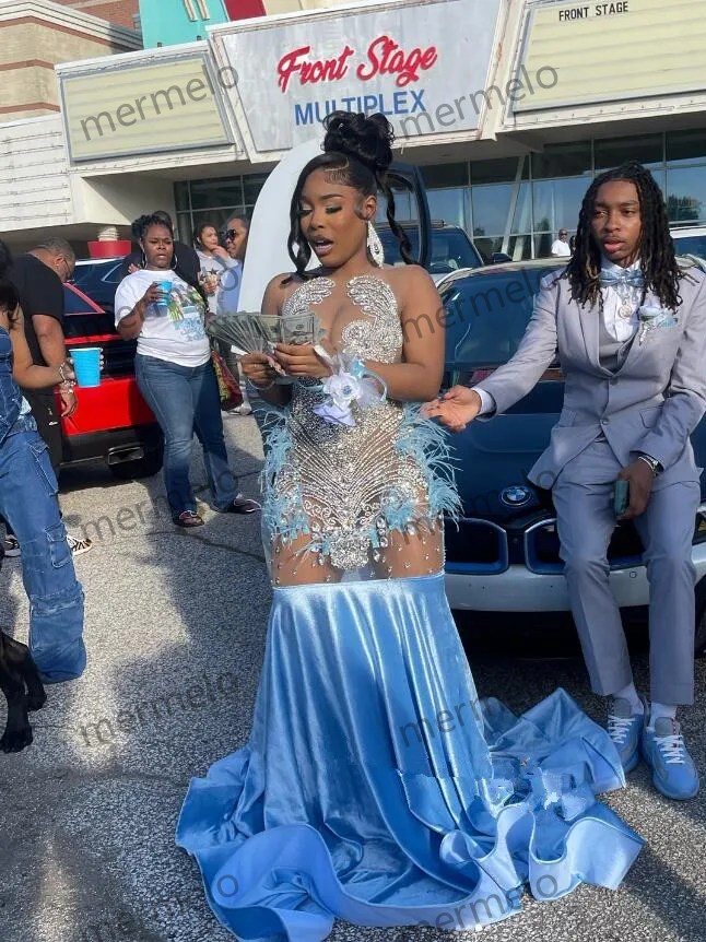 Sky Blue Sparkly Long Evening Party Dresses for Black Girl Luxury Diamond