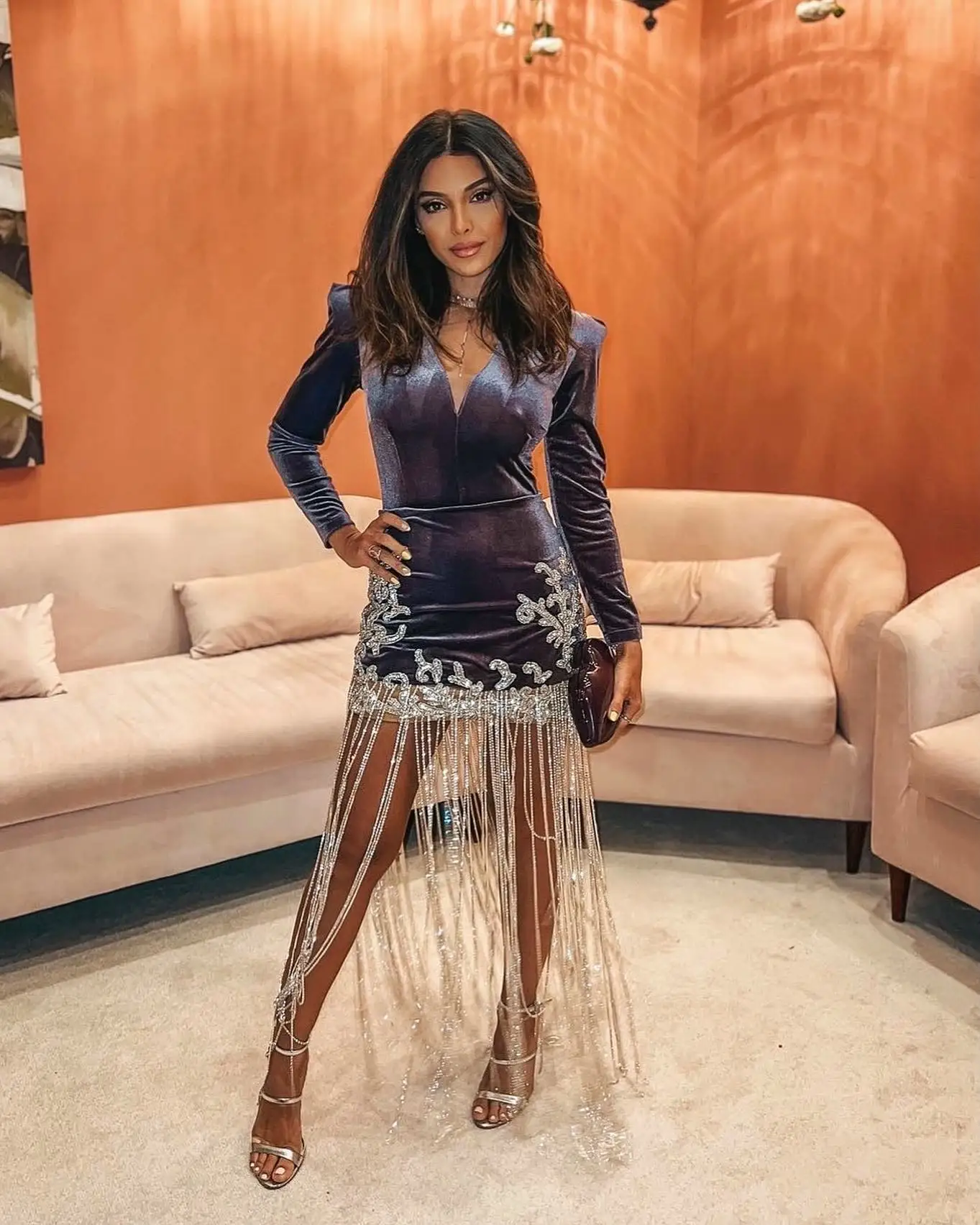 Sparkle Beaded Tassel Sheath Velvet Women Maxi Dresses To Party Full Sleeves V-neck Modest Crystal Prom Gowns