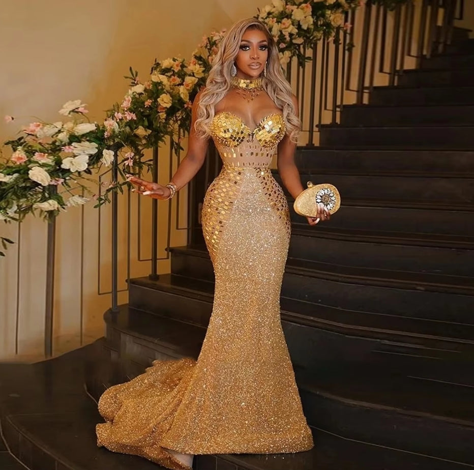Sparkle Crystals Mermaid Long Prom Dress Luxury Sequins Mermaid Evening Dress Sexy Black Girls Wedding Party Gowns