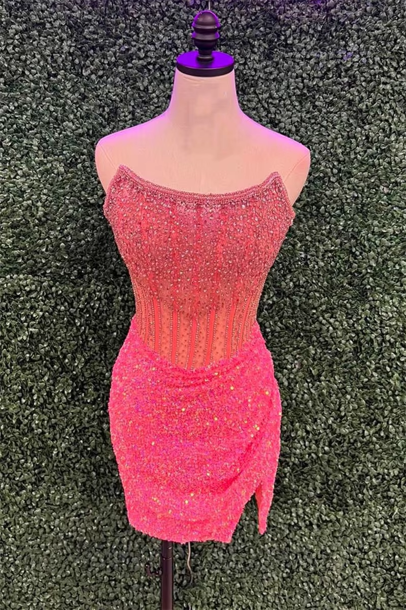 Sparkly Bodycon Strapless Corset Sequin Mini Homecoming Dress with Slit Scoop Neckline Prom Dress Sleeveless A Line Evening Gown