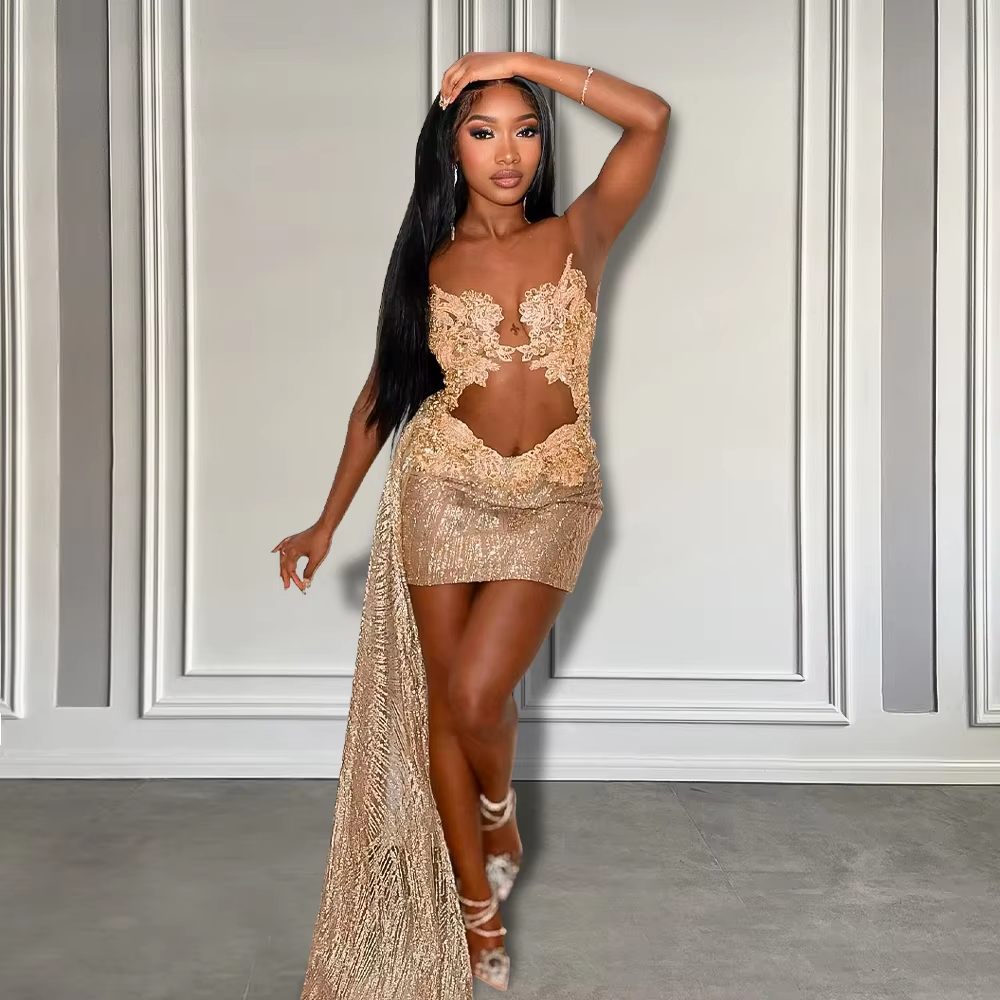 Sparkly Gold Glitter Lace Birthday Formal Dress Women with Side Train Luxury Beaded Short Prom Cocktail Gowns 2025