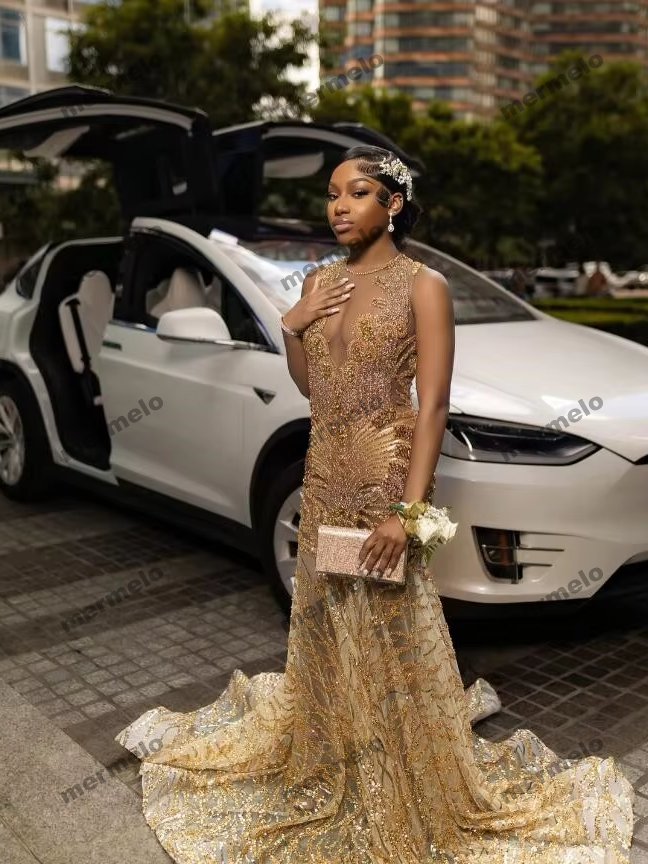 Sparkly Gold Long Mermaid Prom Occasion Dresses For Black Girl Luxury Crystal Gillter Tassel Evening Gown Birthday Gala