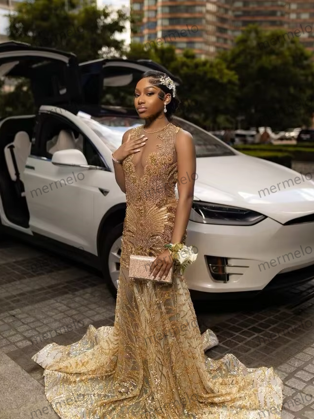 Sparkly Gold Long Mermaid Prom Occasion Dresses For Black Girl Luxury Crystal Gillter Tassel Evening Gown Birthday Gala