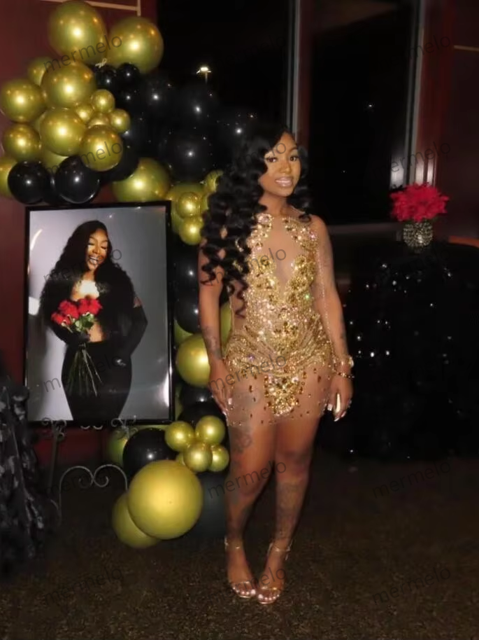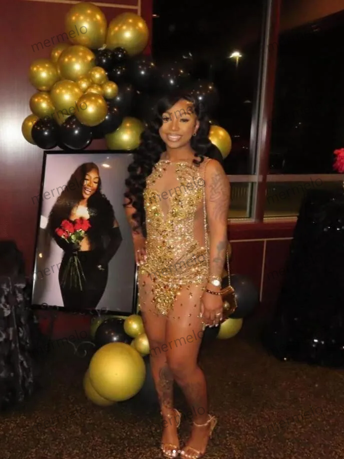 Sparkly Gold Short Prom Homecoming Dresses Sheer Mesh Crystal Beaded Black Girl Graduation Gown
