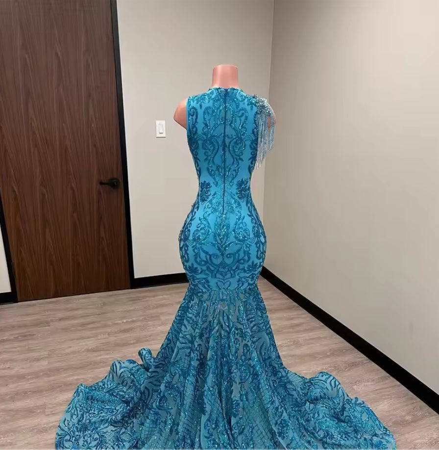 Sparkly Lace Peacock Blue Prom Dress Long 2025 Luxury Beaded Black Girls Mermaid Fitted Prom Gowns with Tassel Customized