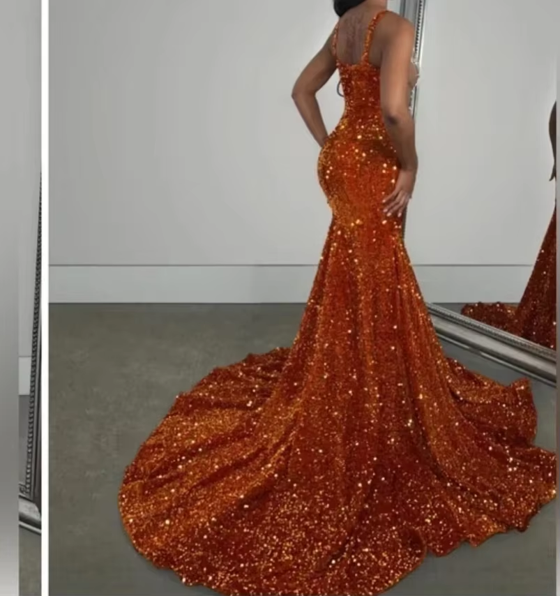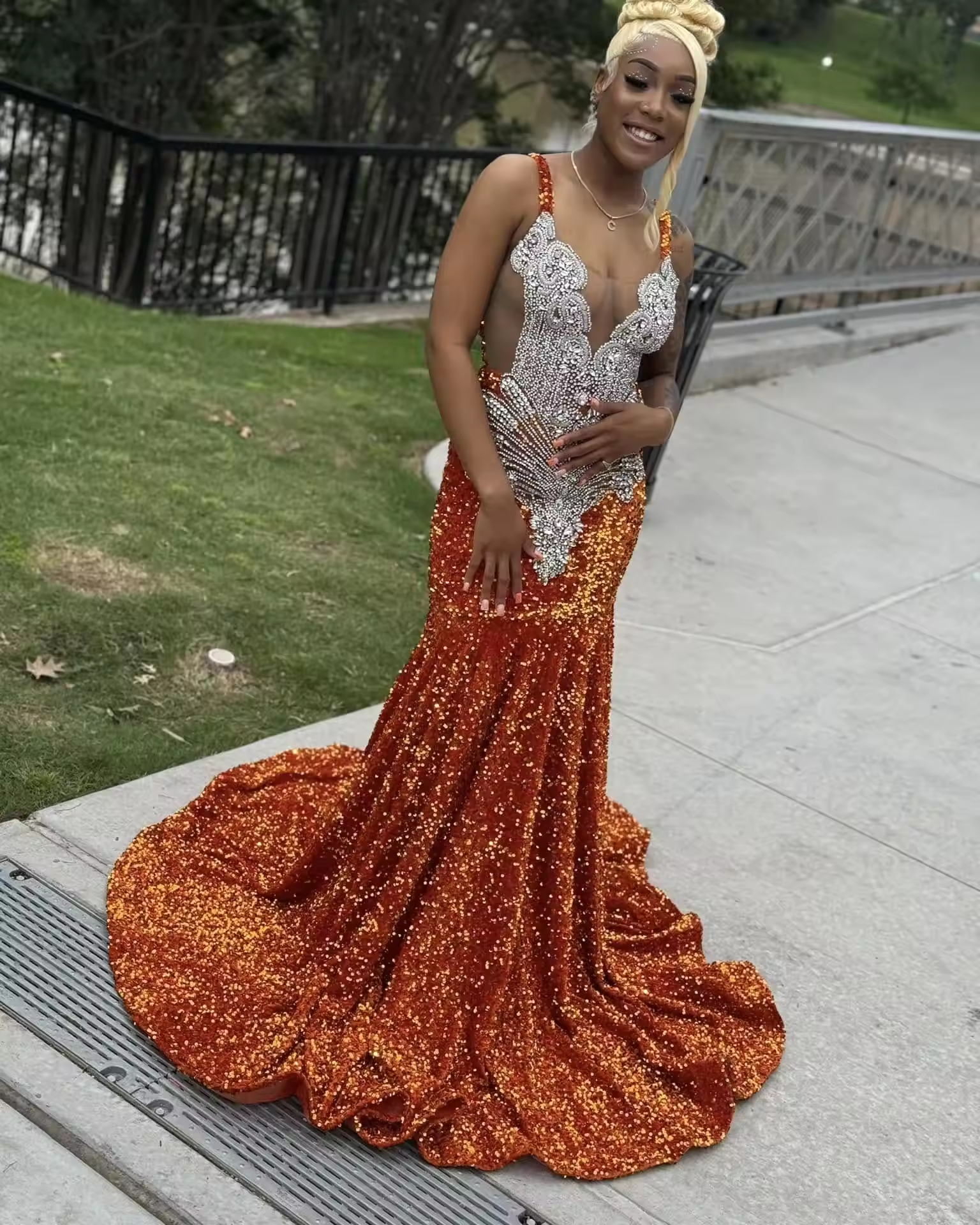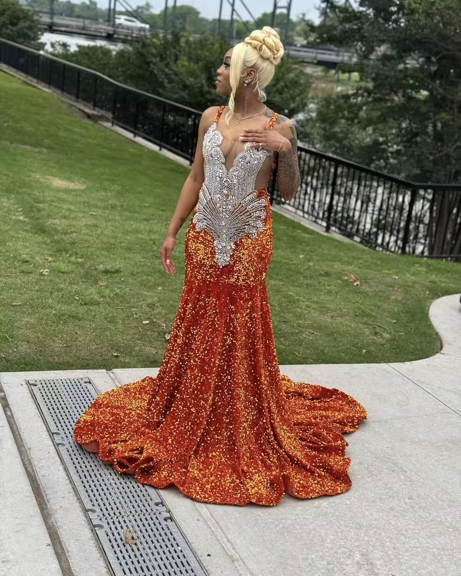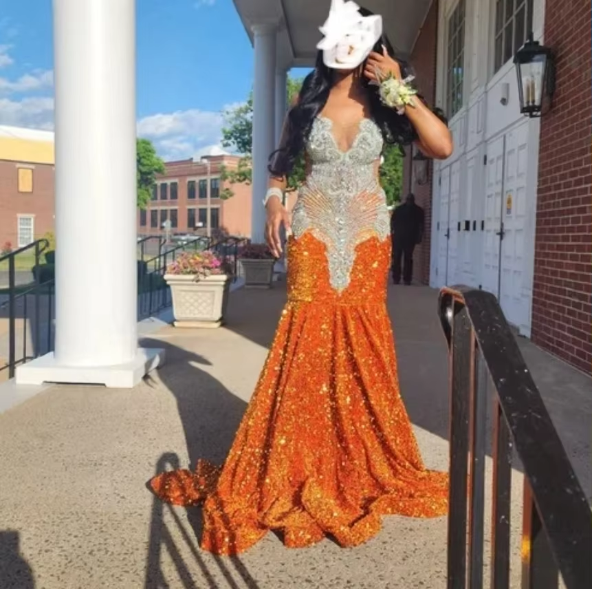 Sparkly Orange Diamond Prom Dress 2025 Full Sequin Mermaid Aso Ebi Evening Dress African Nigeria Formal Occasion PartyCustomized