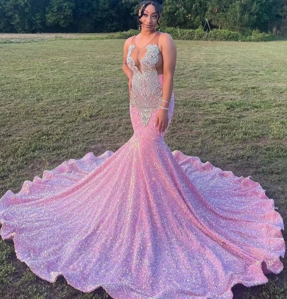 Sparkly Pink Prom Dress 2024 Sexy Mermaid Luxury Silver Diamond Black Girls Sequined Evening Gowns Robe De Soiree