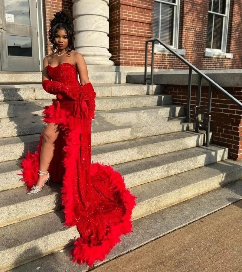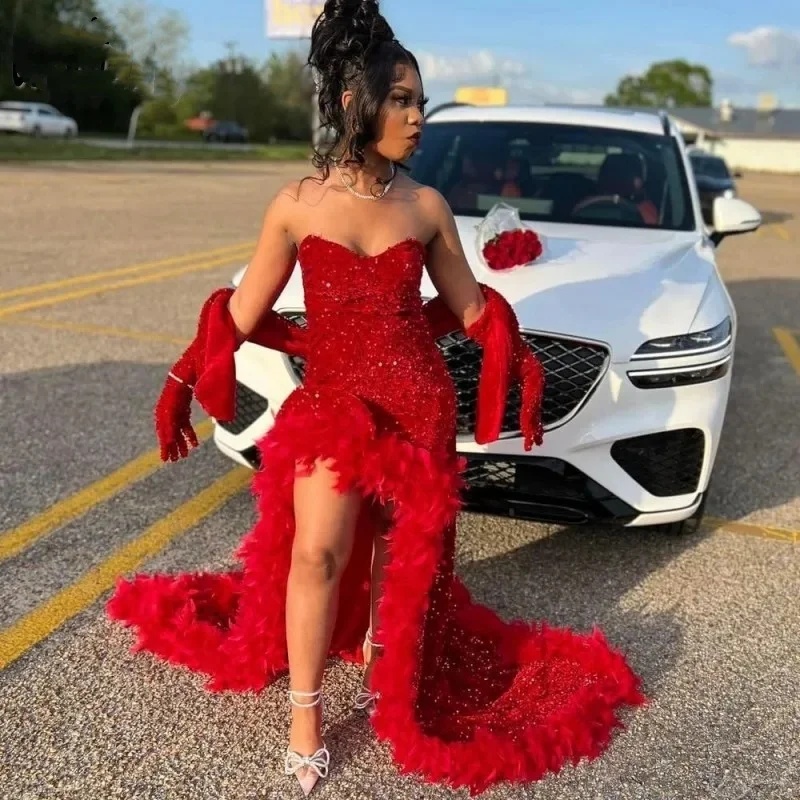Sparkly Red Mermaid Prom Dresses For Black Girl 2024 Sweetheart Sexy Front Split With Wrap Vestidos De Fiesta Evening Occasion G