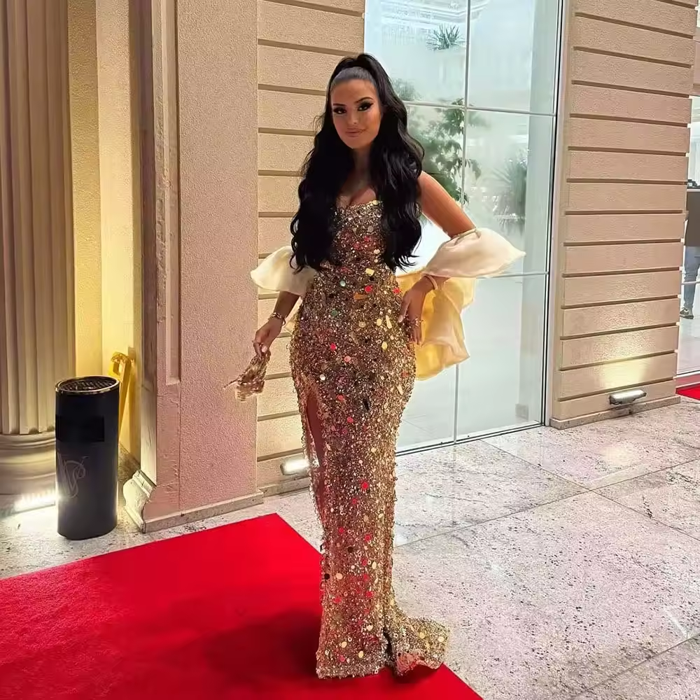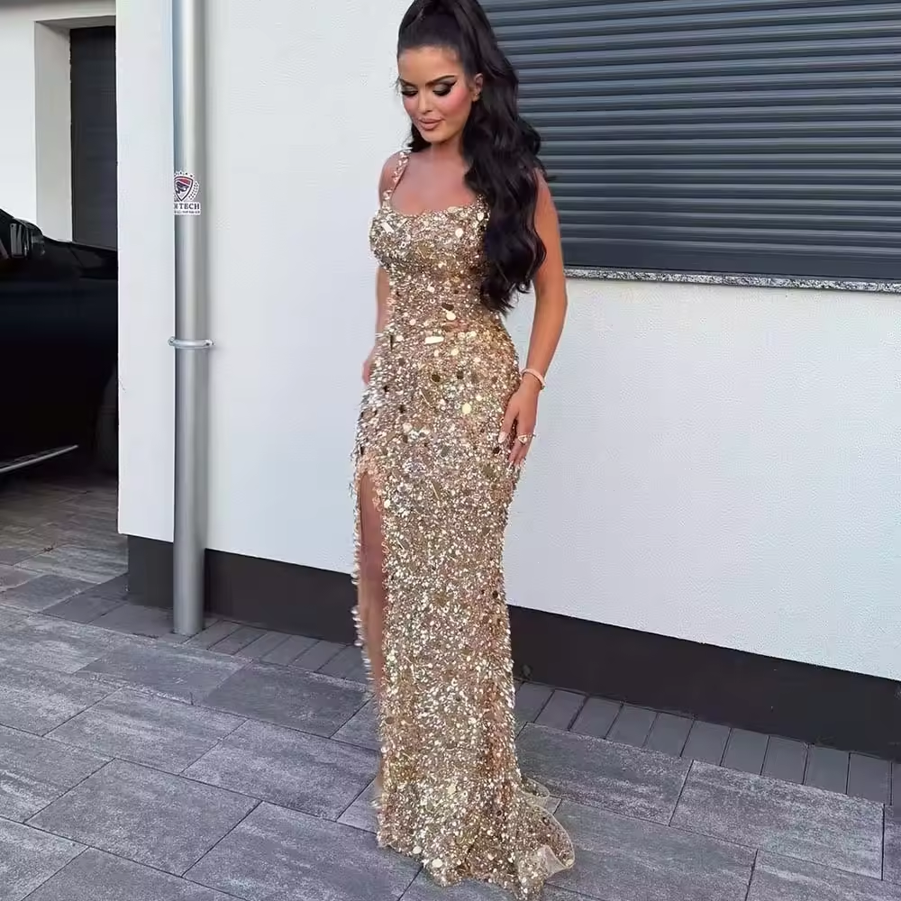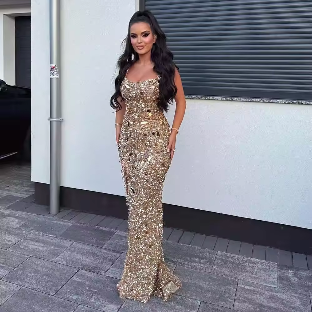 Square Neck Gold Sequin Backless Maxi Evening Dress for Women Wedding Party Gowns Graduation Party Dresses Customized