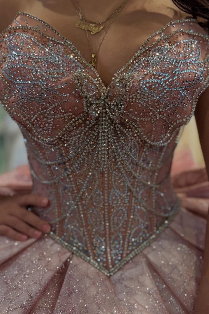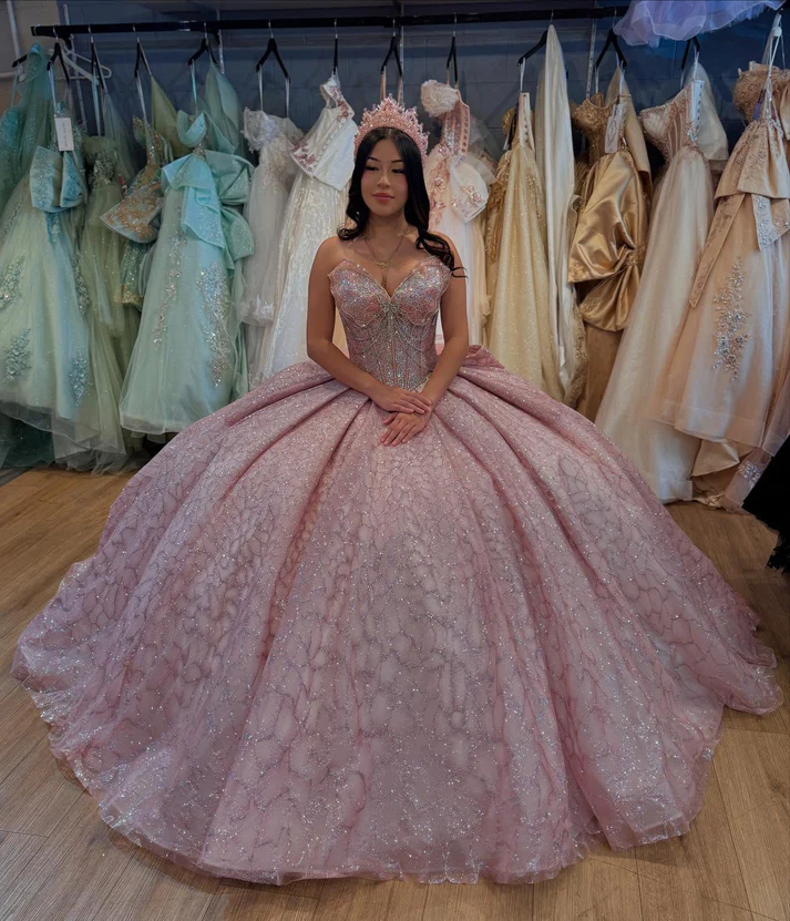 This strapless, sleeveless quinceañera dress in soft pink features intricate beading that adds subtle sparkle and elegance. A charming bow knot detail highlights the waist, creating a flattering and graceful silhouette. Perfectly crafted for your Sweet 15 celebration, this gown combines delicate embellishments with timeless design to ensure you look radiant on your special day.