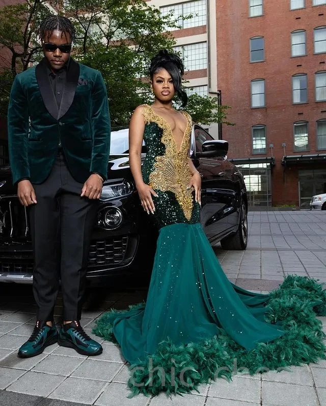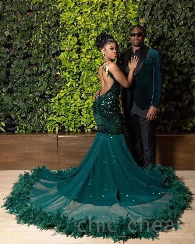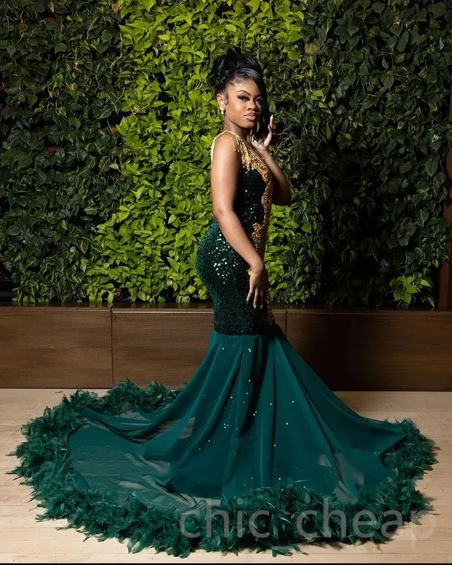 Teal African American Prom Dresses Mermaid Sheer Beaded Crystals Feather Black Girls Nigeria Robe De Soiree Evening Dresses Gown