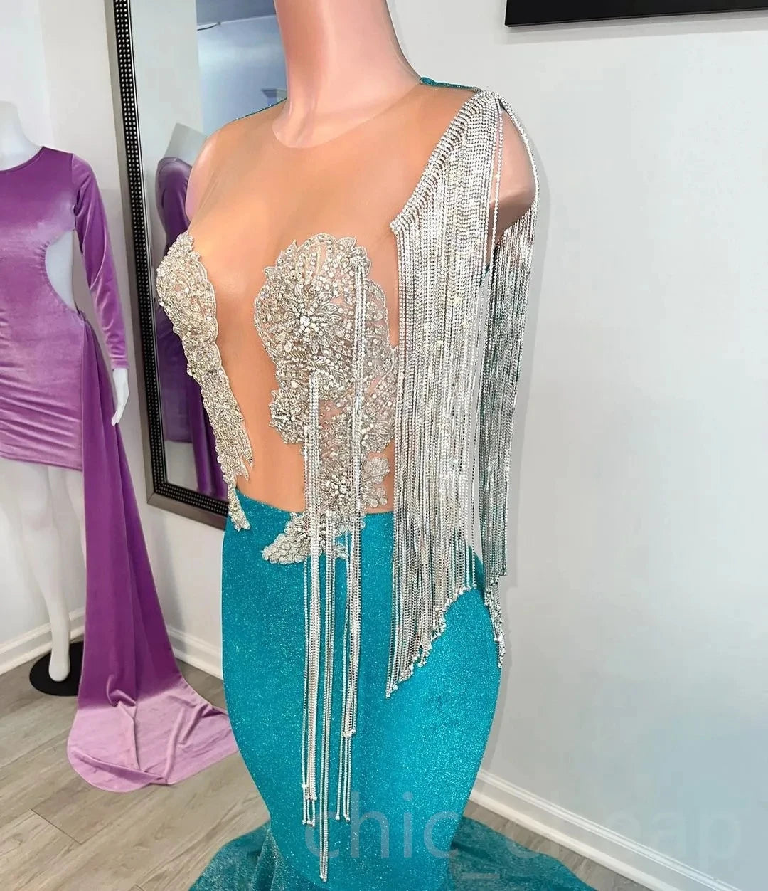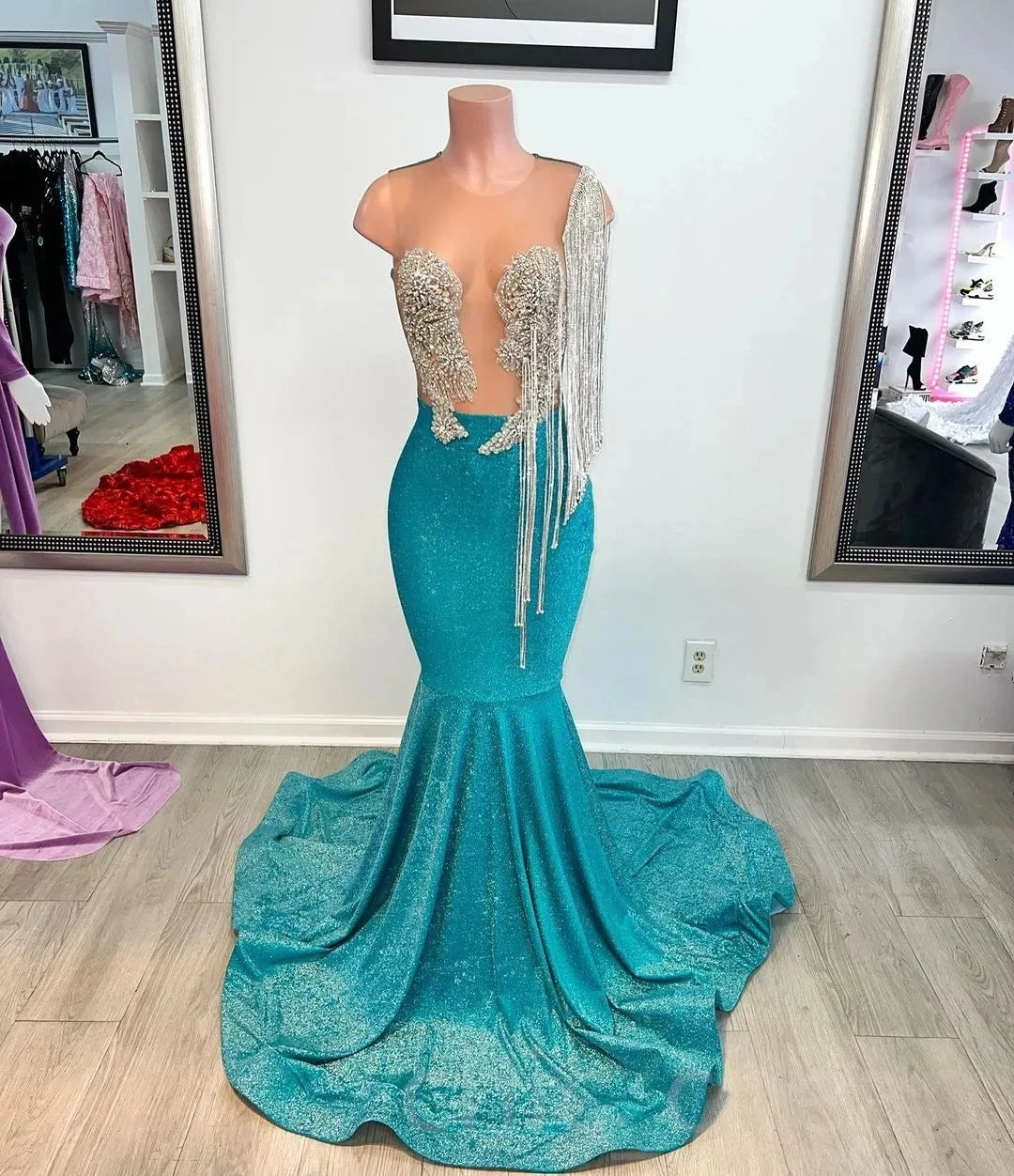 Teal African American Prom Dresses Mermaid Sheer Sequins Beaded Sparke Black Girls Robe De Soiree Evening Dress Gown Customized