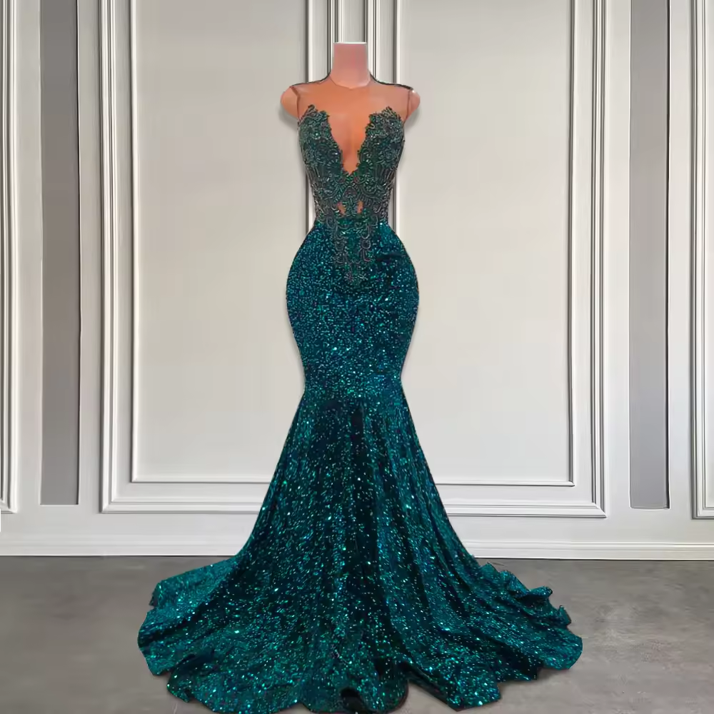 Teal Sequin Formal Party Prom Gowns 2025 Sparkle Beaded Bodice Mermaid Black Girls Luxury Green Prom Dresses Customized